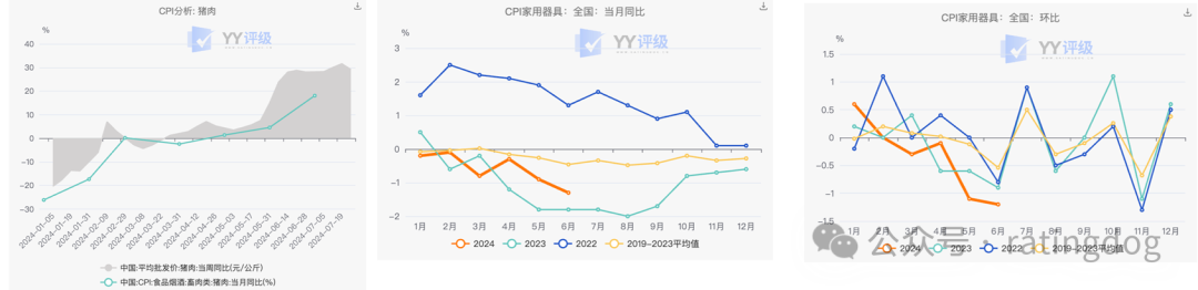 食品、生活用品方面:6月猪肉价格呈明显上涨趋势;CPI家用器具价格同比-1.3%,环比降幅扩大至1.2%,为近几年环比最大降幅。