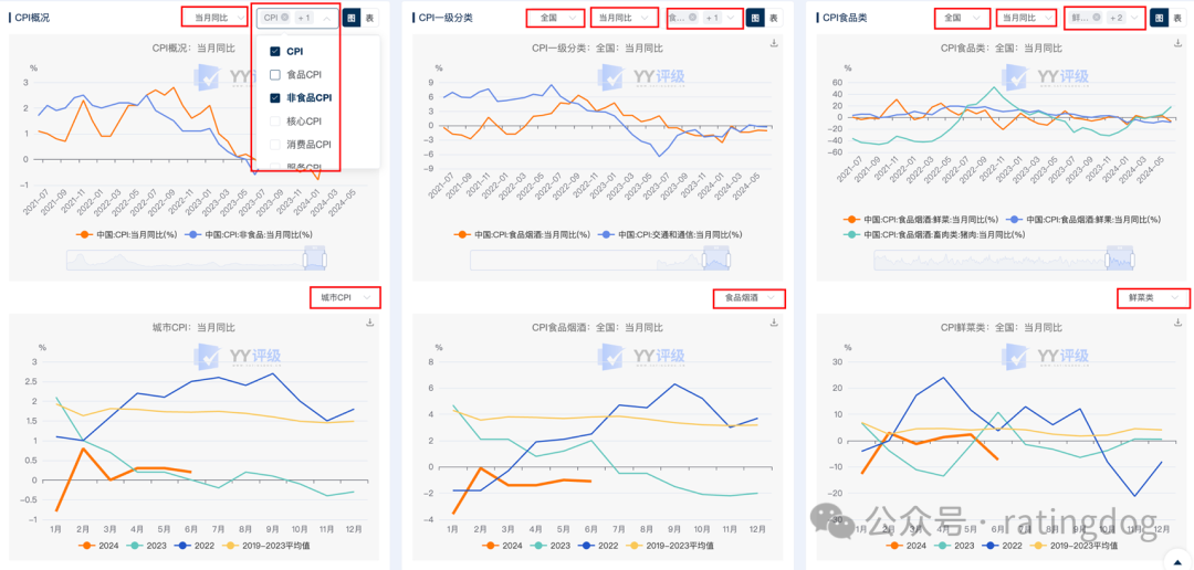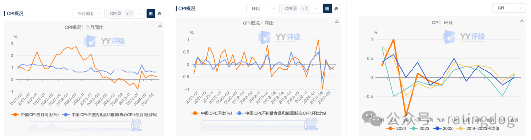 CPI概况、CPI一级分类、CPI食品类三个子板块均以上下两图的形式展示各明细指标的走势图和季节性图