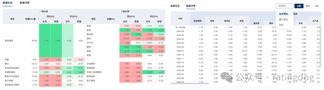 数据总览全方位展示中国CPI一级、二级各细分类项目的权重以及同比、环比情况,让用户对通胀构成有更清晰的认识