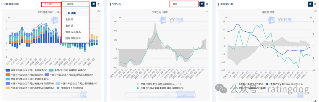CPI板块分为关键指标、CPI概况、分项详情、通胀分析、增速贡献、CPI分析、通胀剪刀差等多个维度展示通胀相关的各项数据信息以及分析框架。
