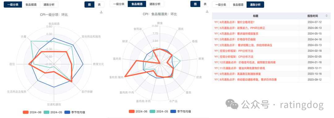 雷达图从最新一期、上一期和季节性均值三个维度展示CPI一级分类和食品烟酒细分项的环比情况,直观呈现数据变化趋势。