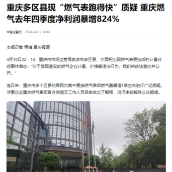 【重庆燃气利润暴涨824%,这事必须有个交代】像燃气、电力、水务这些涉及民生的领域,压根就不应该让企业上市,一旦企业上市之后就完全变味了,他的终极目标就是为了做好业绩提高利润,推动股票的上涨,然后套现离场。在这种因素驱动之下,有些企业就可能铤而走险,甚至通过一些不正常的手段来推动业绩和利润的增长,但这种做法最终却由普通的市民买单。